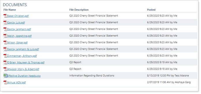 In this example, the user sees a number of PDF reports listed that they had recently generated. They also see global files posted by other firm users.