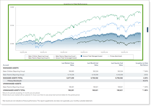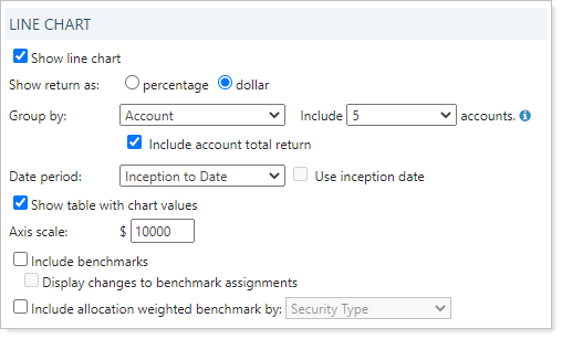 This setting allows you to show a line chart of performance for accounts, groups, categories, benchmarks, or indexes on the report, then select whether they are shown in percentage or dollars.