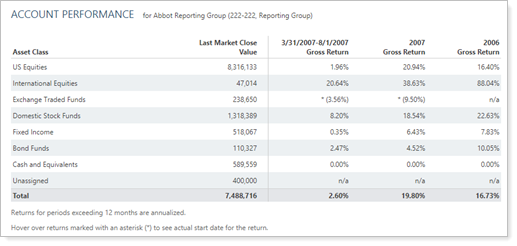 To see the line chart, select the Show line chart check box. Choose how you would like returns displayed. You can choose percentage or dollar. The date period for the line chart is set by the first period chosen in Show return or net investment gain list.