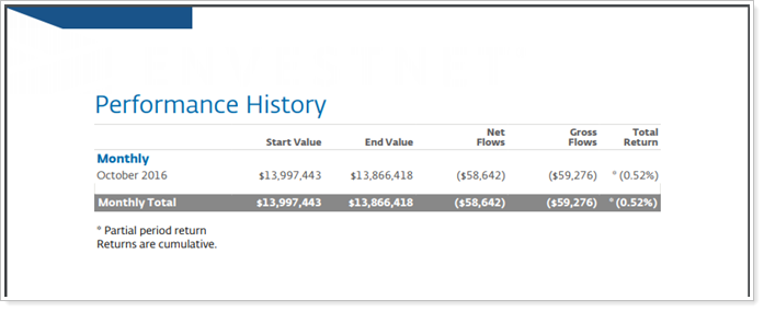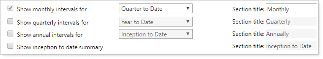 The Performance History report displays basic account activity and performance values for a variety of different intervals. These settings allow you to add specific intervals to the Performance History report. The following intervals are available: