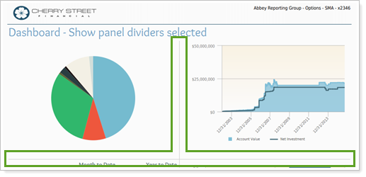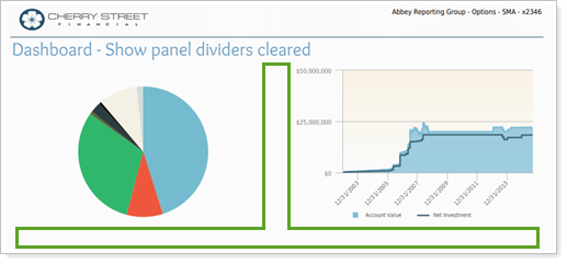 This setting allows you to show or hide lines between each panel in the PDF Dashboard report. You might choose to show or hide the lines depending on your firm's branding. Adding divider lines emphasizes that each panel is a discrete unit, perhaps to be taken as separate concepts, whereas omitting divider lines makes the dashboard report look like everything on the page is focused on one concept.
