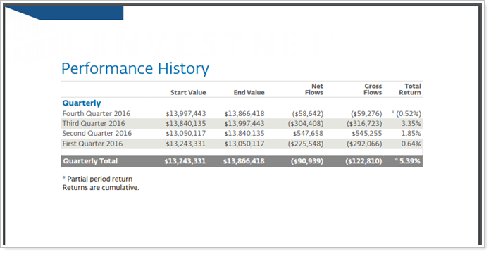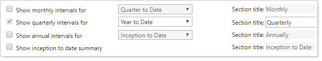 The Performance History report displays basic account activity and performance values for a variety of different intervals. These settings allow you to add specific intervals to the Performance History report. The following intervals are available: