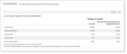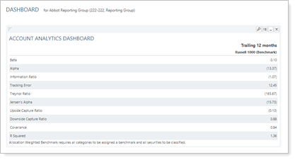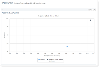 Risk vs. Return Scatter Plot. The dashboard report shows the Risk vs. Reward Scatter Plot as configured in the Account Analytics report and based on the date period you set in the dashboard settings.