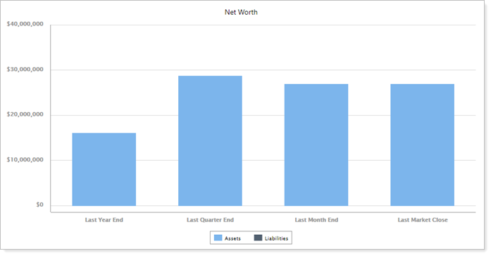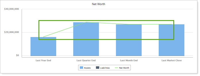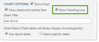 Use this Net Worth report setting to choose to show or hide a trending line on the chart in the Net Worth report. It is only available if you select the Show Asset and Liability Bars check box. Control the color scheme of the dynamic chart in the Site Theme under Color Options and the PDF chart in PDF Themes.