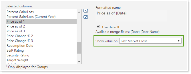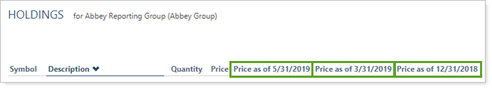 The Holdings report allows you to see holdings for a specific date, the As of Date, that you select. You can add the columns Price as of 1, Price as of 2, and Price as of 3 to the report, which allow you to show the price for the holdings on the date you designate. This report setting allows you to set the price as of date.