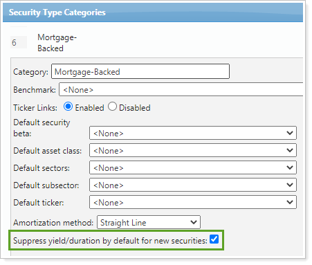 Use this category setting to suppress yield and duration reporting for all new securities added to this category type. Suppress yield/duration by default for new securities is available for fixed income, mortgage-backed, CD, T-bill, and commercial paper security types.