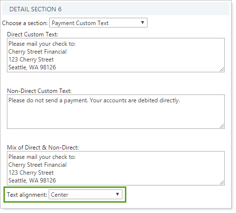 When you add custom text to a billing statement, this setting allows you to determine the alignment of the text on the statement.