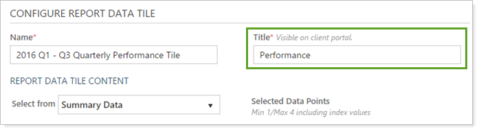 On client views pages, reports, and dashboard tiles, you have two fields for labeling a dashboard tile: Name and Title. Clients can see the Title. This setting allows you to set what title you want clients to see for the page, report, or tile. The title field does not have to be unique. Titles must be 20 characters or fewer.