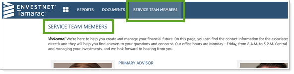 The Title is set to Service Team Members. On the client portal, the page is labeled Service Team Members.