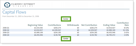 This PDF report setting lets you designate where on the page the top custom text is displayed. You can also add bottom custom text and configure the bottom text alignment.