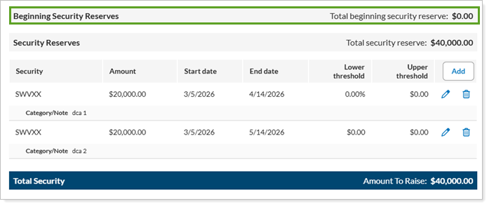 Beginning Security Reserves shows the unadjusted initial value the account holds for the security reserve symbol. The symbol may exist in the model, or it may be a substitute for a security in the model. You can’t change this value. It is updated based on the system value.