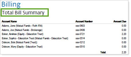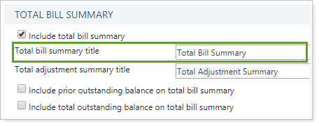 This billing PDF report section setting allows you to customize the name of the total bill summary section on the billing statement.