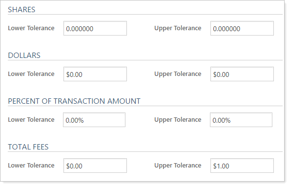 Leave all Shares and Dollars fields at 0, your Percent of Transaction Amount fields as 0, and use $1 for Total Fees tolerances. This ensures that those transactions that are truly accurate will auto-reconcile. If problems arise in future reconciliation, you can identify them early and adjust accordingly.