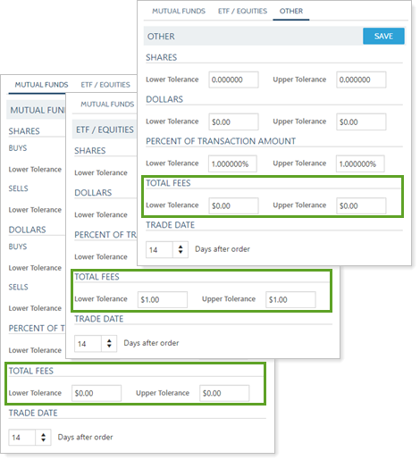 Reconciliation tolerances are used in automatic reconciliation and serve as thresholds when comparing your trade orders with the actual trade executions from your portfolio accounting system. Total Fees lets you set an upper and lower threshold when Tamarac Trading compares the total fees applied to the orders you create versus the actual trade execution.