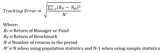 Tracking error is a measurement of how much the return on a portfolio deviates from the return on its benchmark index. It is the standard deviation of the differences between the return on the portfolio and the return on the benchmark; the standard deviation of the excess returns.