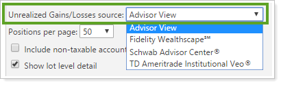 To designate what data source the report uses, choose the source from the Unrealized Gains/Losses source list. You will only see custodians with data feeds for your firm.