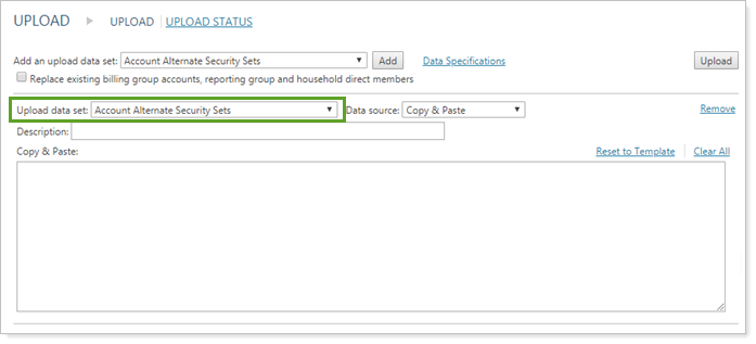 Use this upload setting to change the data set type for an upload data set you've already added. For example, if you intended to add an Account Information upload data set but realize after clicking Add that you've added an Account Holdings upload data set, use the Upload data set list to switch to your desired upload data set.