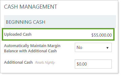 The value of Uploaded Cash contributes to the account's Total Beginning Cash value. The Uploaded Cash value can only be changed via upload.