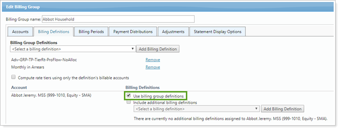This billing group setting allows you to designate which accounts in the billing group use the definition applied to the billing group. All accounts within the billing group have Use billing group definitions selected by default.