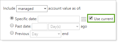 Use this bulk report setting to set the Specific Date to today's date when configuring the date for Include Managed/Unmanaged/Total Account Values As Of. Unlike most Specific Dates, it is a rolling date that always applies to the current date, not to a certain specific historical date.