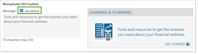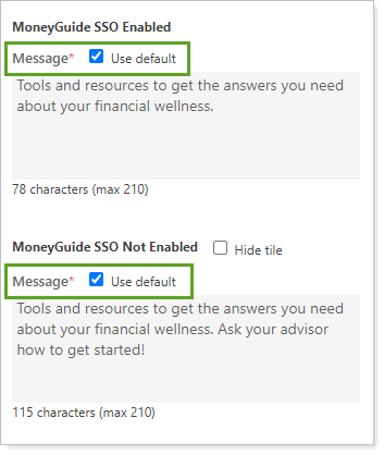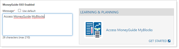 Use the Use default check box to choose whether to use the default message for the MyBlocks by MoneyGuide SSO dashboard tile or compose your own message.