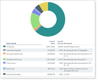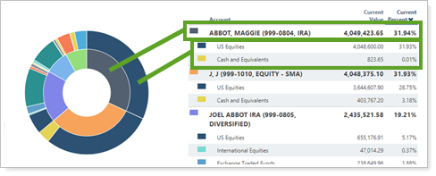 On the Asset Allocation report, when you Group by/then by, the donut chart includes both grouping levels. For example, if you group by Account and then by Asset Class, the donut chart displays accounts on the inside and asset classes in each account on the outside.