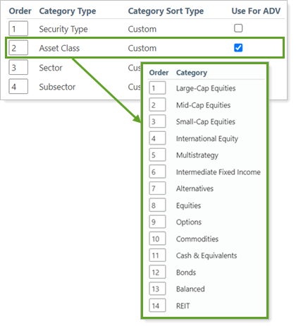 You select Asset Class as the category type you're going to use by selecting Use For ADV. Asset Class is made up of the categories Large-Cap Equities, Mid-Cap Equities, Small-Cap Equities, and so on.