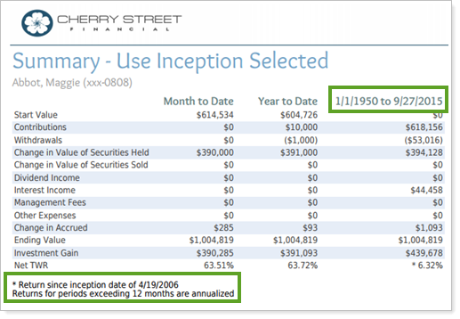 In this example, a date period of 1/1/1950 to 9/27/2015 was added to the report. With the Use inception date option selected, even though the data do not cover the full extent of the date period, the report includes the column, reporting as much as is available. A footnote that indicates the actual date range.
