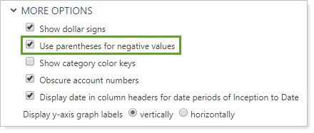 If you select Use parentheses for negative values, Tamarac Reporting will differentiate negative numbers from positive numbers by using parentheses. For example, $(1,000).