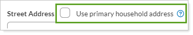 Use primary household address, when selected, automatically fills in the mailing address for the selected account with the primary address for the Household. By managing the address at the Household level instead of at the account level, you can make address updates less cumbersome—any changes made to the Household address will flow through to any member addresses where this option is selected.