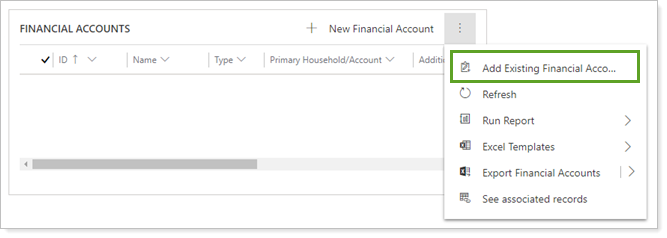Click Add Existing Financial Account next to Financial Accounts to add financial accounts held in the trust. This option may be found in the menu. Search for the financial account and select it when it appears. When finished, click Add.