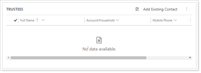 Click Add Existing Contact next to Trustees to add the contact or contacts that are trustees. Type the name of the trustee and select the name when it appears. When finished, click Add.