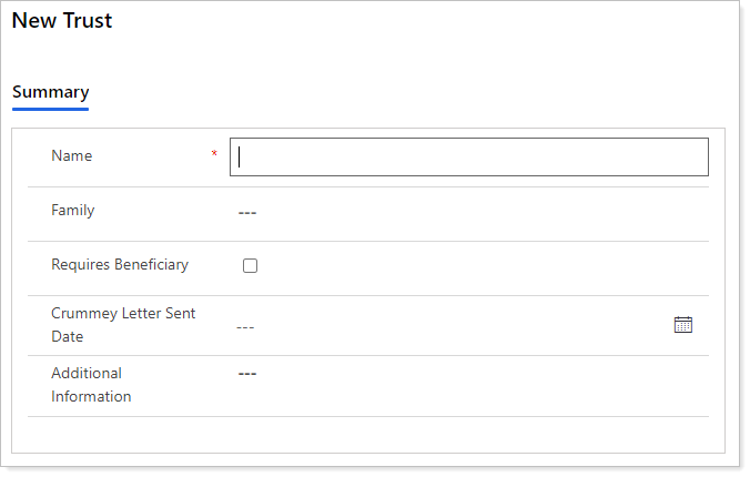 Field Name More Information Name* Name of the trust. Family Family where this trust will be assigned. Requires Beneficiary Select this check box to indicate that a beneficiary is required and to display the trust on the Beneficiary report. Clear the check box to remove the trust from the Beneficiary report.
