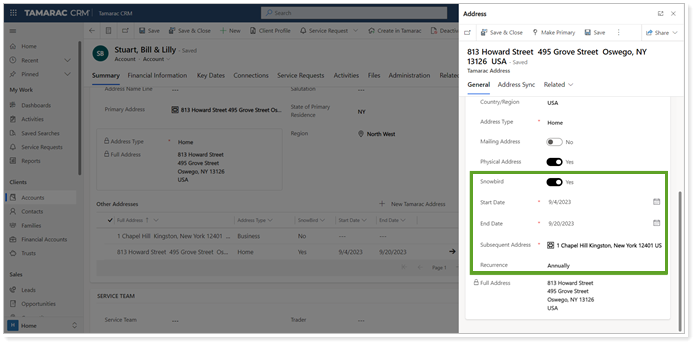 The Snowbird feature will automatically change the client's Primary Address based on their schedule. Before you start, you will need to set up the Snowbird feature for custom forms.