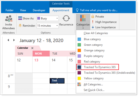 In order to have that appointment sync over to CRM, use your Track To Dynamics 365 category. This will tell the system to push the appointment in CRM, but the Set Regard will still be blank.