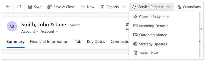Service requests create workflows that can help standardize and automate your administrative processes in Tamarac CRM. To meet your firm’s specific needs, you can customize service requests with your unique data and actionable follow-up.