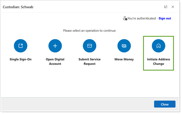 Once enabled, you can access the Schwab integration from Custodians on the command bar of an Account record and select Initiate Address Change to launch the feature in Schwab Advisor Center.