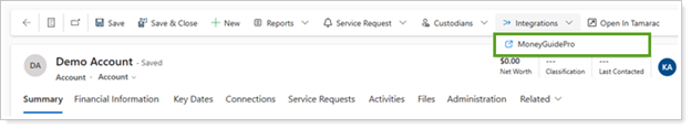 This integration requires configuration. For more information about configuring and using the MoneyGuide SSO in Tamarac CRM, see Introduction to the MoneyGuide Integration in Tamarac CRM.