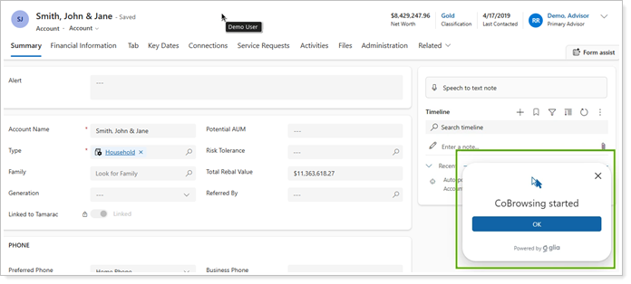 With this enhancement, Tamarac CRM now offers shared browsing functionality, also known as co-browsing, through the Glia integration. This secure, interactive screen sharing takes place in CRM, streamlining troubleshooting, enhancing onboarding experiences, and improving overall support.
