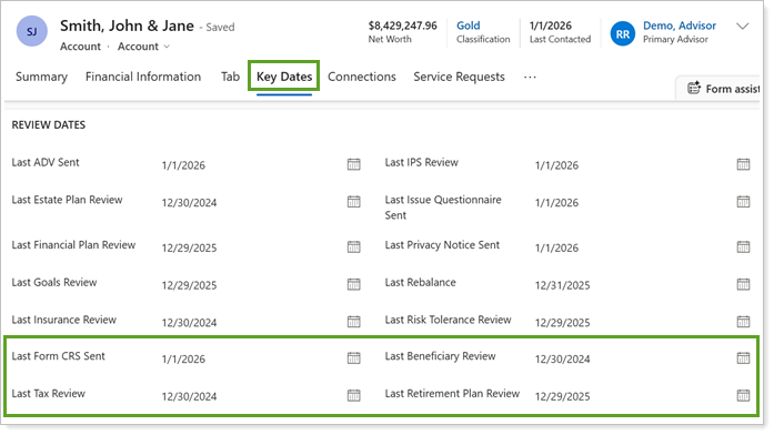 Staying on top of important client milestones, reviews, and compliance activities helps you maintain oversight and deliver timely service. In Tamarac CRM, you can track these important dates directly on account records on the Key Dates tab.