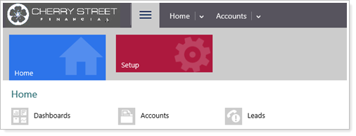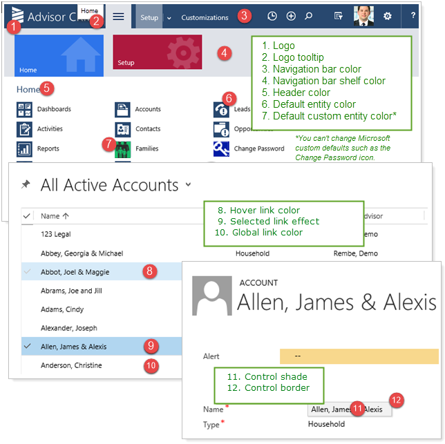 Data Managers can use the new Themes option under the Setup menu to add your firm's logo and set custom colors by entering hexidecimal color codes (e.g., #000000) for each for your navigation bar and UI elements—including links, menu bars, and other visual elements. The screenshots below show the areas of Advisor CRM that you can set custom colors for, indicating what they're called on the Themes page.