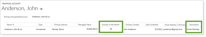 We added this column to the Financial Account page as well, and included another new field for Association, so you can see how the Financial Account is related to the Household—whether it's a direct member, indirect member, or both.