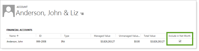 We added an Include in Net Worth column on the Accounts page so that you can see the account's inclusion in, or exclusion from, net worth. If you enabled Household membership integration, this field will be automatically populated for linked Households after each sync from Advisor View, based on the selection in a Household's membership settings. If you did not request the integration for your firm, you will be able to enter Yes or No manually for this field.