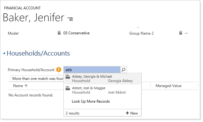 Based on your feedback, we've also made it simpler and more intuitive to assign a Primary Household/Account. Previously the Primary Household/Account list was blank until you populated the subgrid. Now you'll be able to type a name in the list and see available matching options display—even if your subgrid is not yet populated. When you select an account, the subgrid updates automatically for a more intuitive and efficient process.