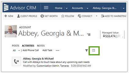 We've updated the way you access activities in Advisor CRM in order to pave the way for some powerful integrations and other enhancements we have planned for the future. You will now be able to access your activities with fewer clicks by clicking in the Social Pane.