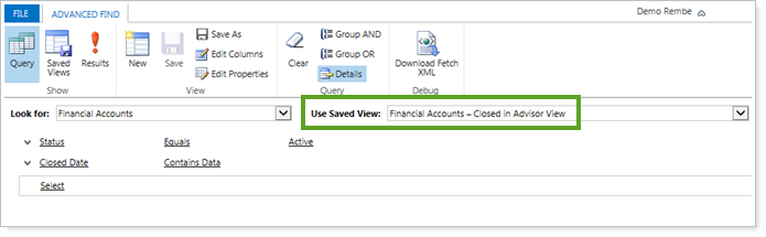 The new Financial Accounts - Closed in Advisor View option in System Views allows you to quickly identify the accounts closed in Advisor View that you may need to take action on in Advisor CRM. It shows you all closed financial accounts.