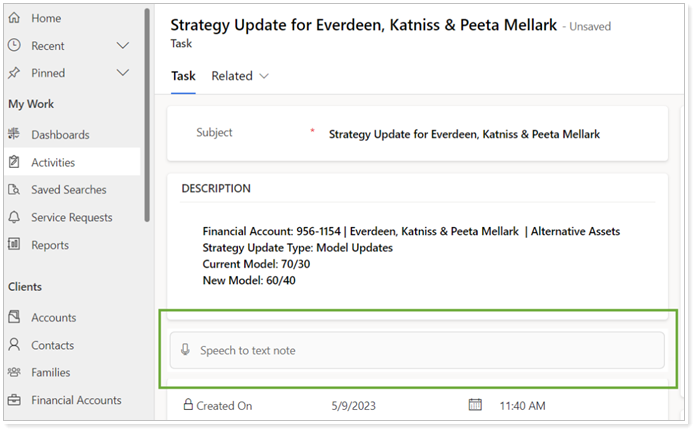 As we continue to enhance the way you maintain your account records in Tamarac CRM, we would like to announce a new feature that allows you to create activity descriptions using Speech to Text (STT) functionality. With this release, we have streamlined your process of capturing and documenting important details by eliminating the need for manual typing.