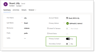 On the Contact record, under Summary, use the new toggles to indicate if a Contact is a Primary Contact or Secondary Contact for their associated Account.