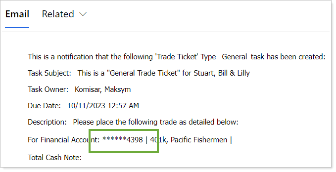 A new field (tam_financialaccount_trunc_id) will be available for you to use in workflows that allows for the redacted Financial Account ID instead of the full Financial Account ID when creating activities.