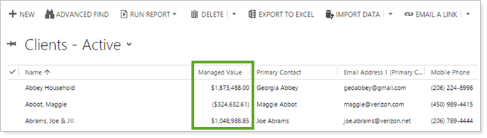 We replaced the old Home Phone column on the Clients-Active view with a new Managed Value column so that you can easily see the total assets under management for each client.